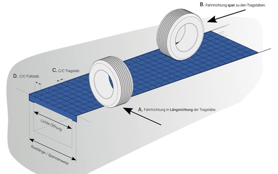 Maschenweite: c/c 34 x 37 mmLast: 40 kN pro Rad