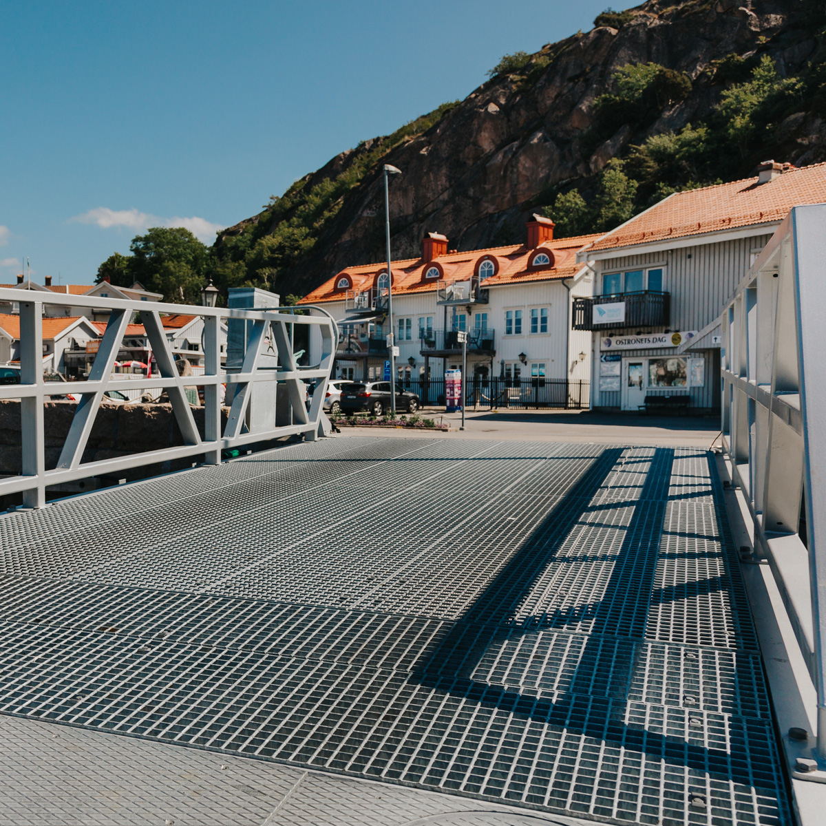 Befahrbares Gitterrost für LKW-Verkehr mit Luftgummirädern.