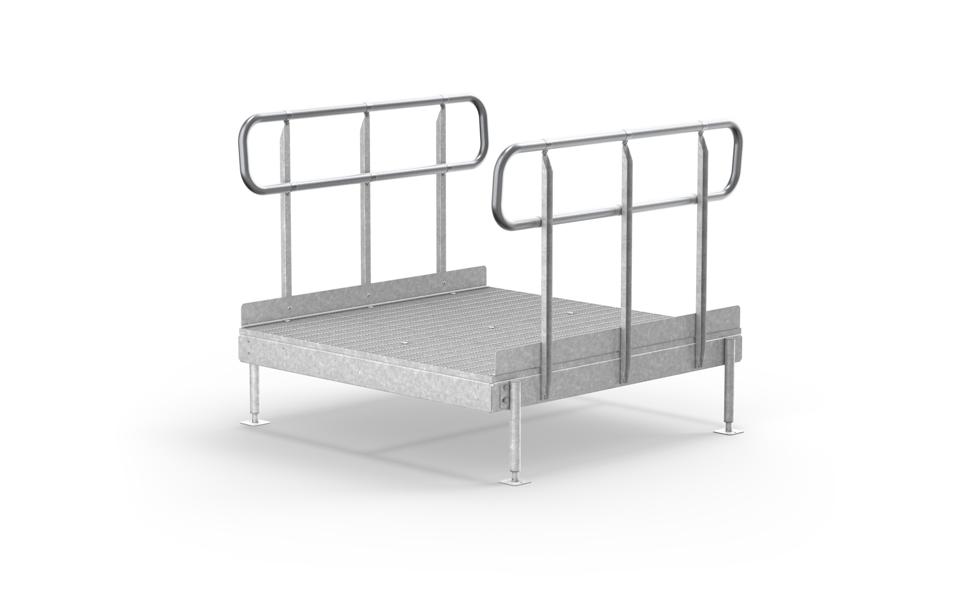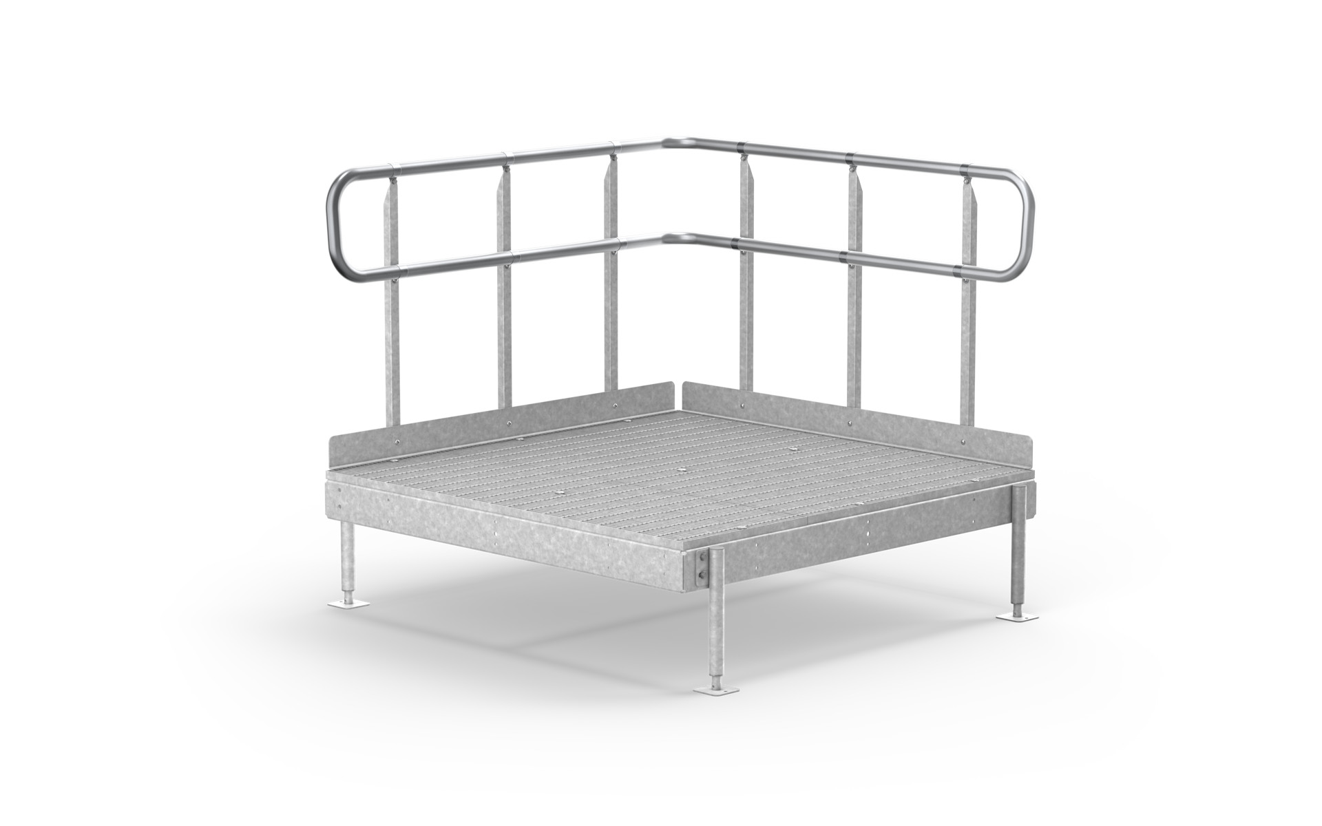 Wir haben Standardpodeste für Rampen aus Gitterrosten auf Lager. Diese Absätze werden auch als Ruhepodeste/Wendeabsätze zwischen zwei Rampen verwendet. Entsprechend der geltenden Vorschriften müssen Ruhepodeste verwendet werden, wenn die Rampe länger als 6 Meter ist. Das gesamte Material ist standardmäßig feuerverzinkt.