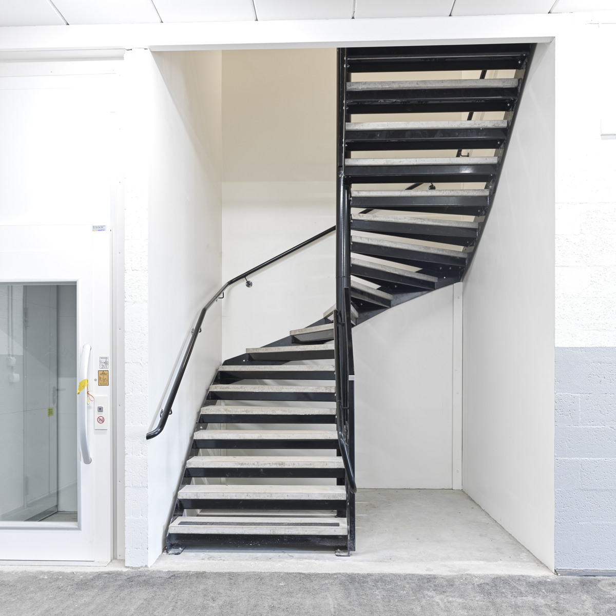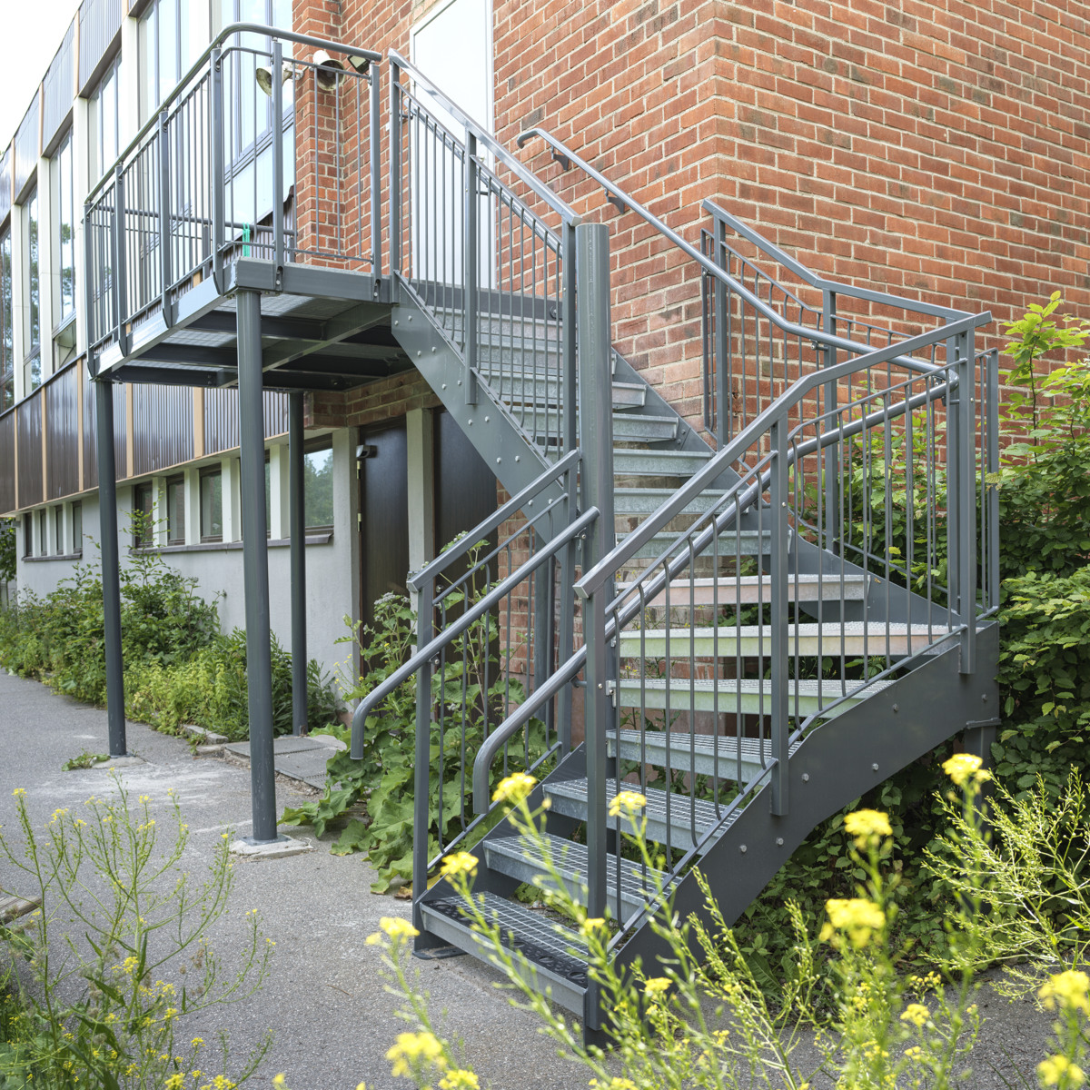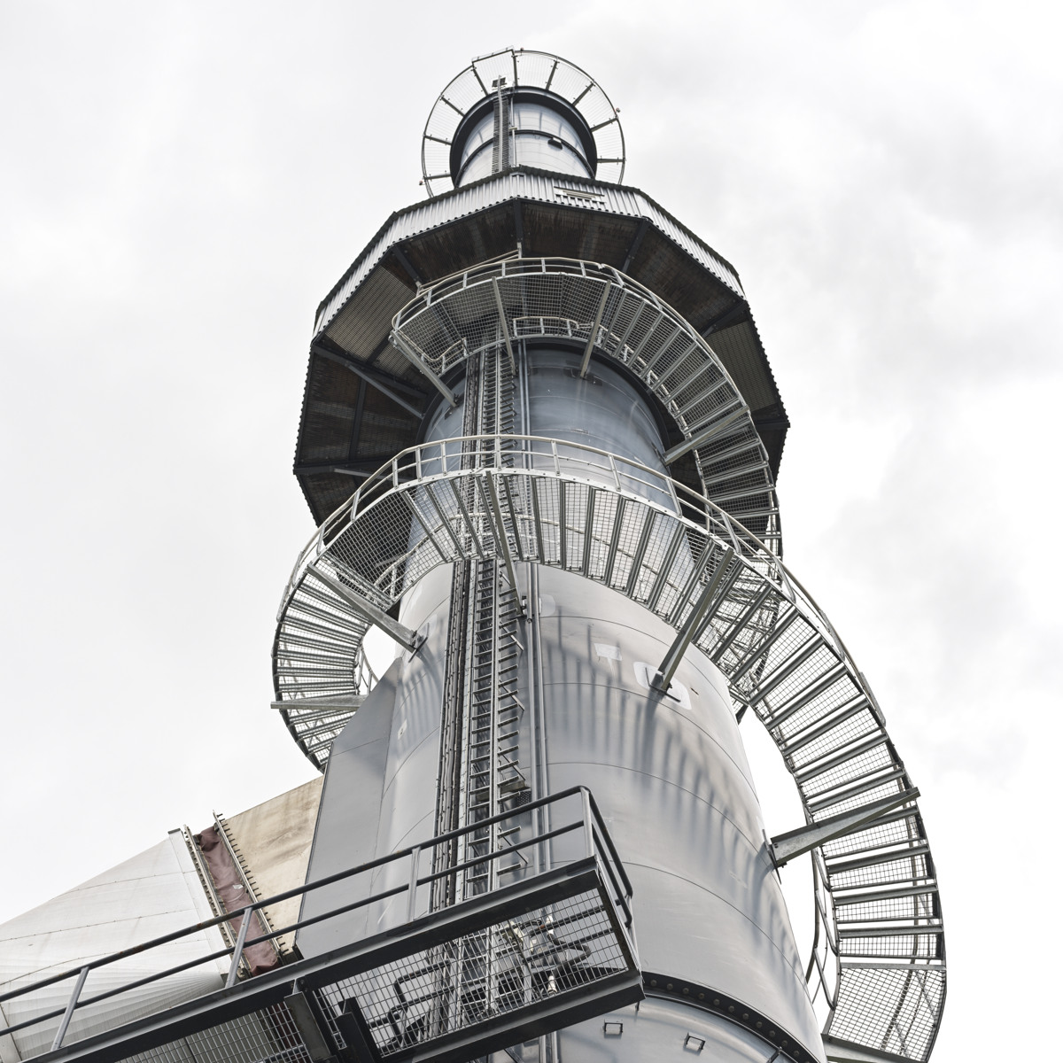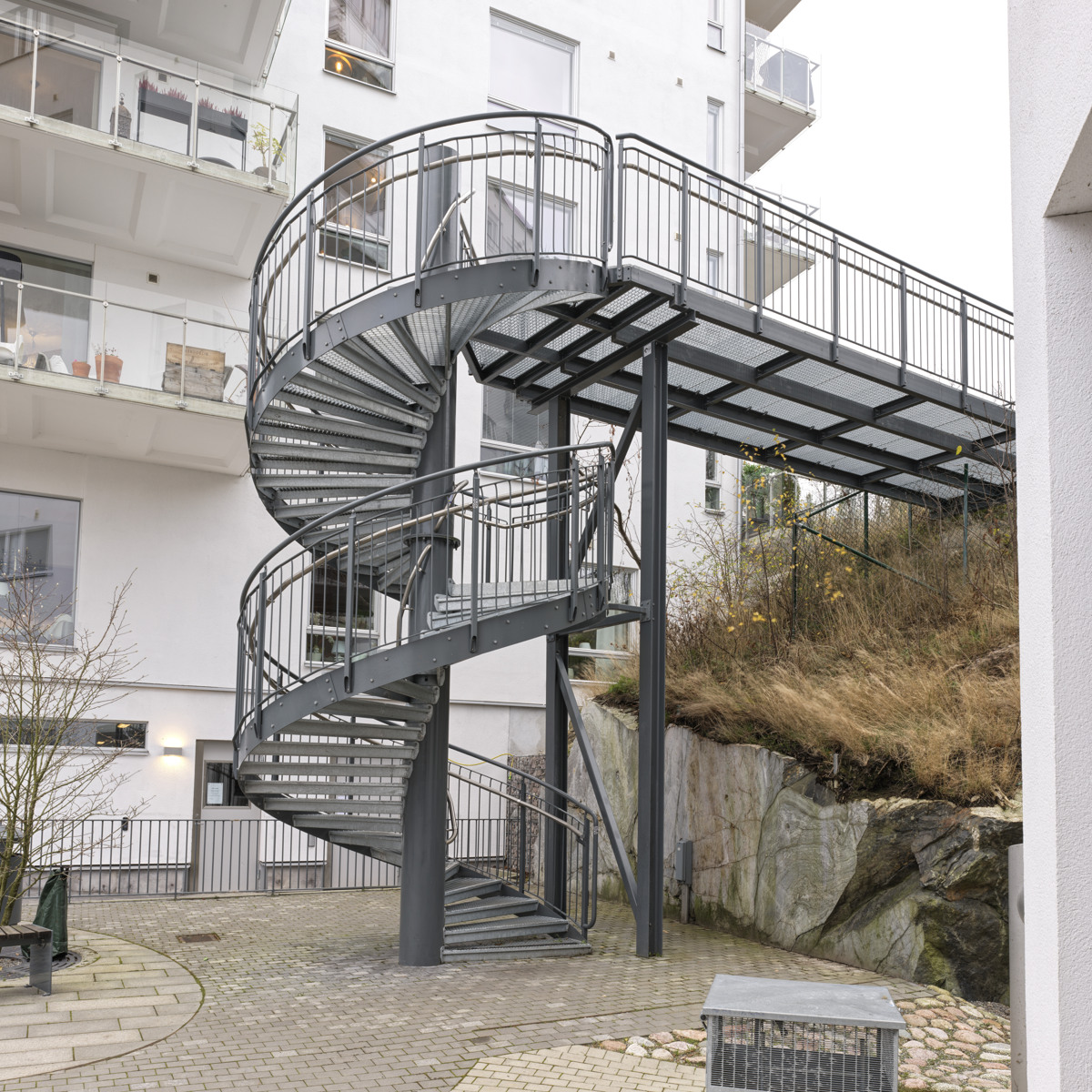 Wendeltreppen werden mit abgerundeten Wangen hergestellt. Stufen und Geländer sind in den gleichen Kombinationen wie für Spindeltreppen erhältlich. Die Treppen können z. B. an der Innen- oder der Außenseite eines Silos angebracht werden.