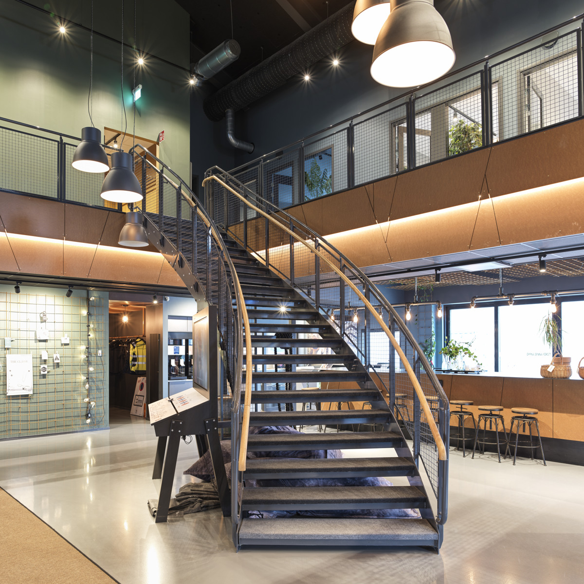 Die Weland Kombitreppe ist eine Kombination aus einer geraden Treppe und einer Spindeltreppe. Im geschwungenen Teil der Treppe werden die Stufen so hergestellt, dass sie dem Treppenradius folgen. Dabei erfolgt eine Kombination mit Stufen und Geländern aus unserem Standardsortiment.